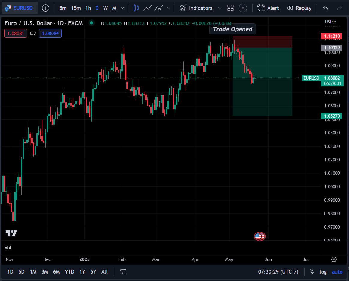 On May 3rd, I opened a Long Dollar / Short Euro trade. The entry was almost the top tick of the day. I am now closing the trade for a gain.