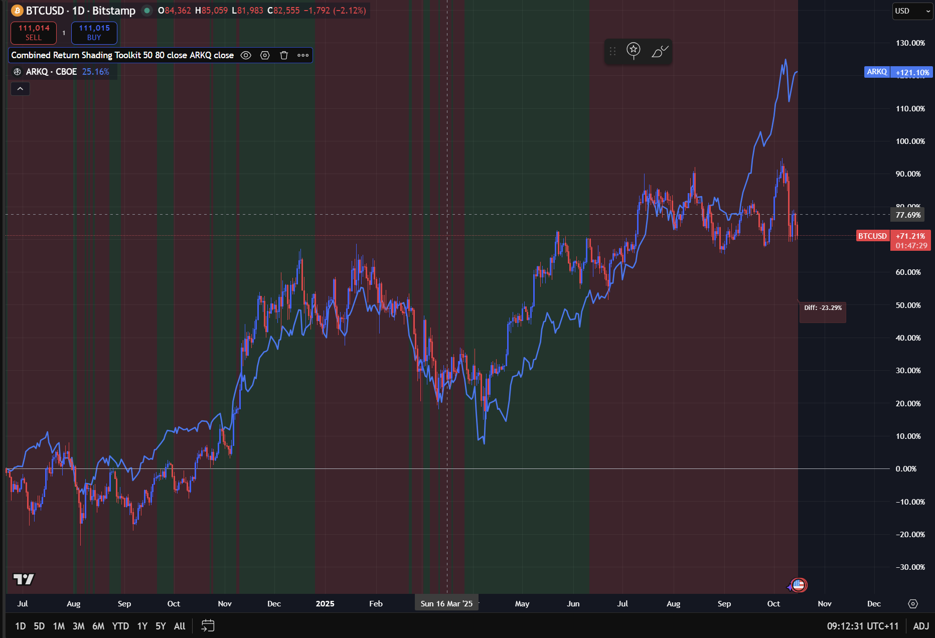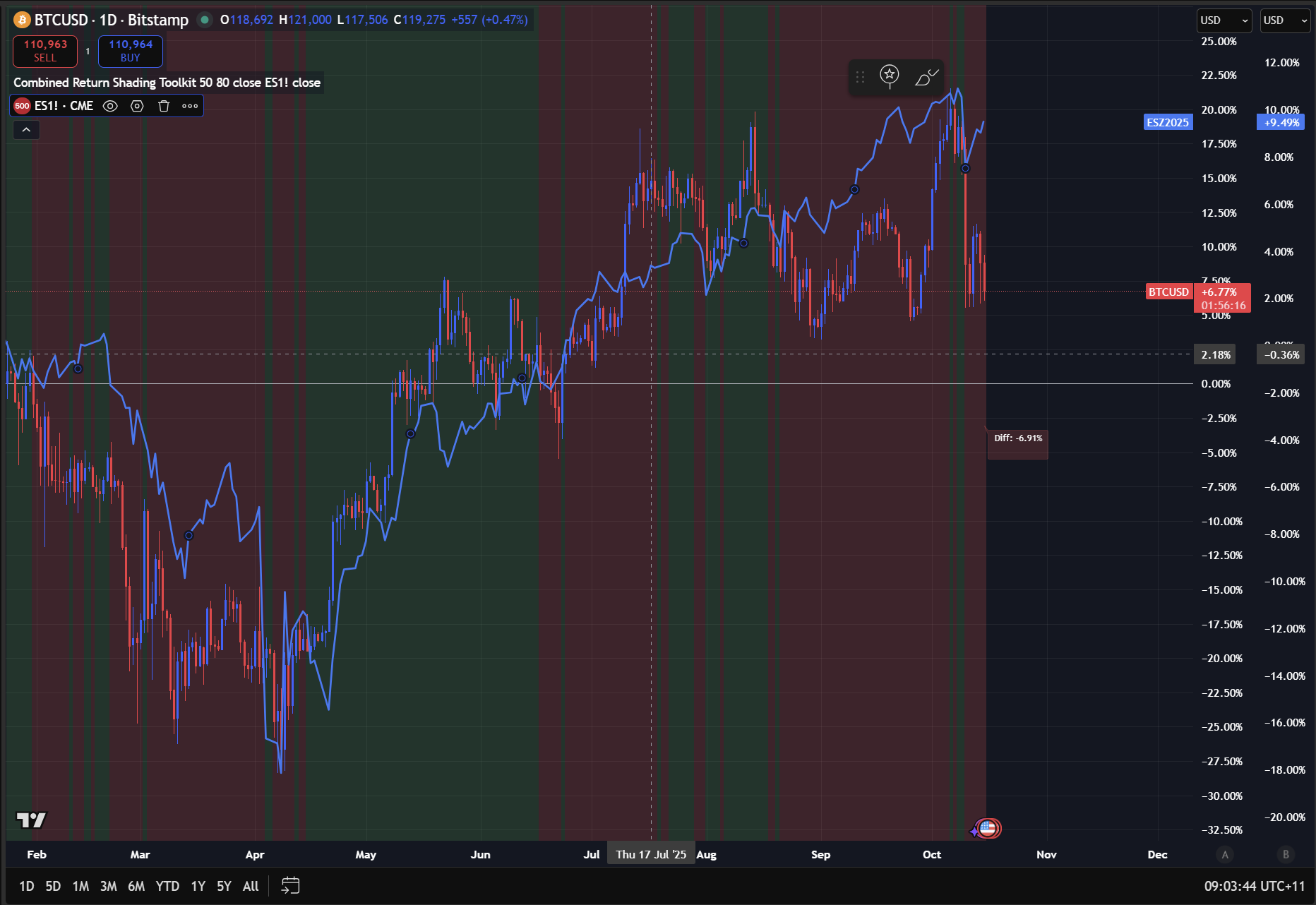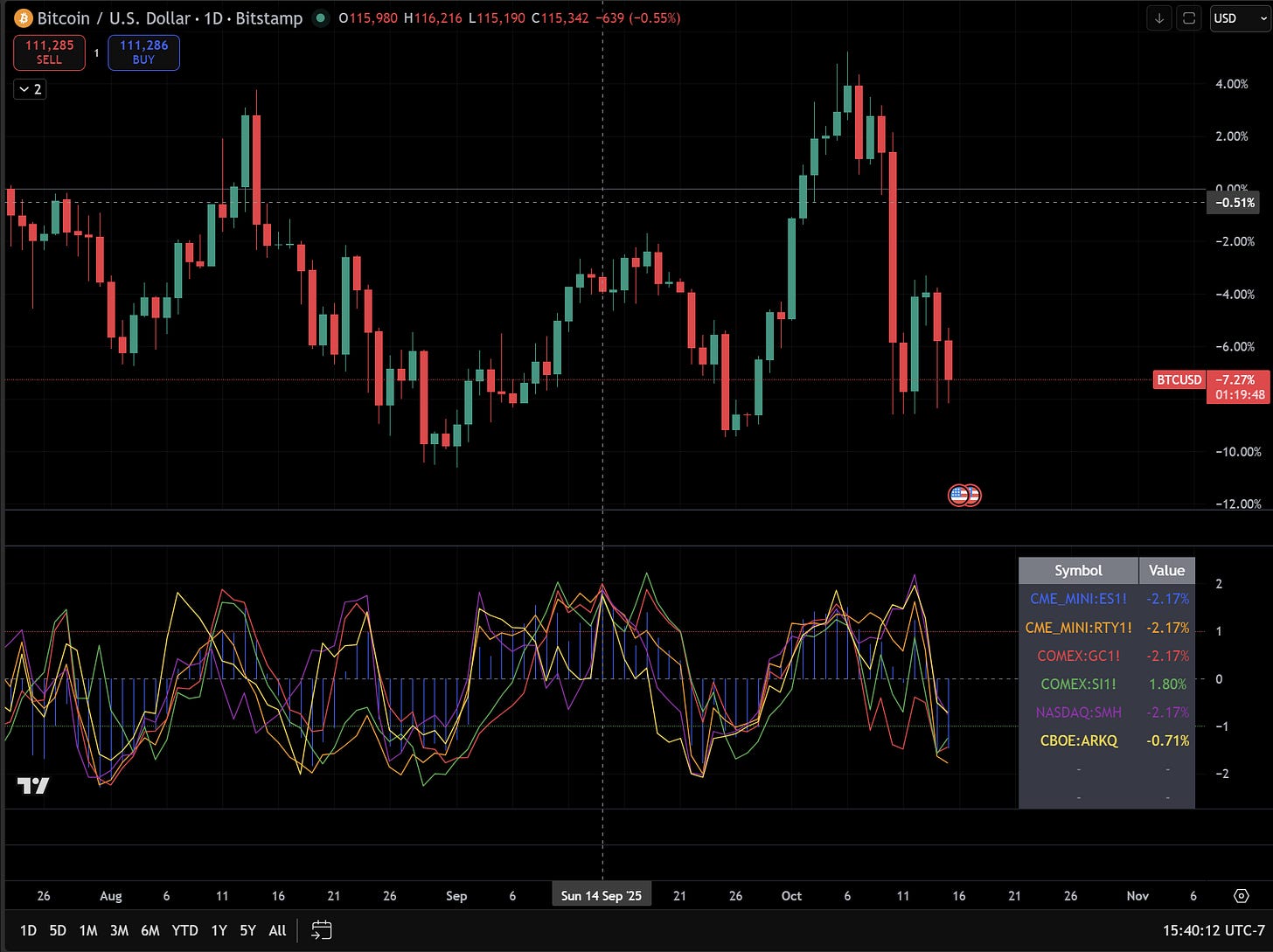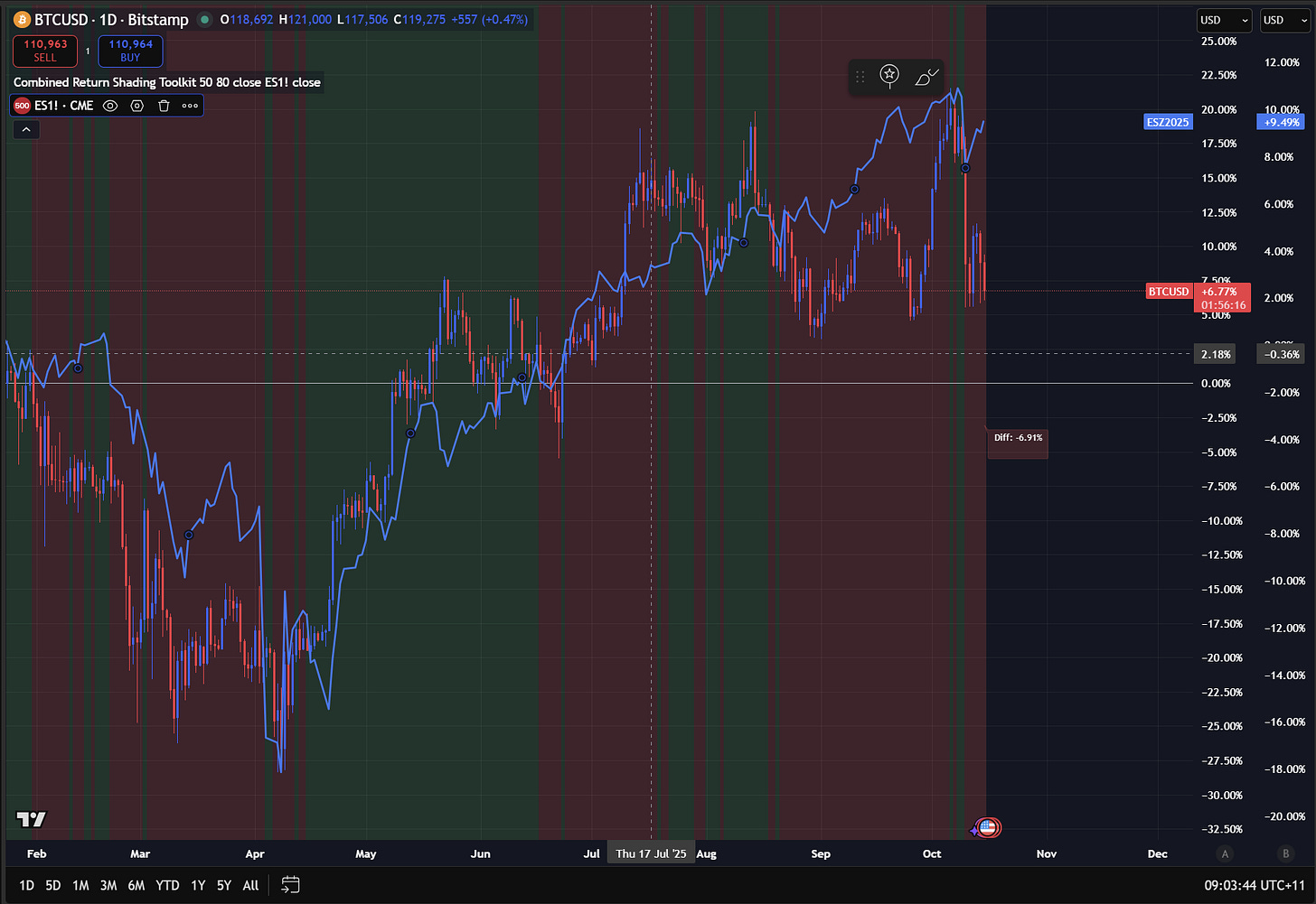 First, Bitcoin outperformed ES (S&P500 futures contract), rallying off the April lowsbut then began to underperform in July, which was the beginning of its neutral range. The chart below has the TradingView Script I linked above, where green shows BTC outperforming ES, and red shows Bitcoin underperforming ES. Most people will just adjust their timehorizon or look back to say Bitcoin always outperforms, which is literally the opposite thing you want to be doing. The way you can know WHY Bitcoin is rallying is by mapping all these incremental changes.