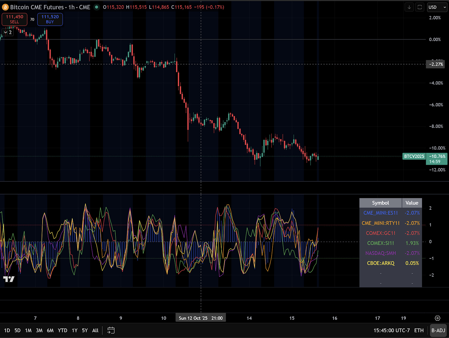 The underperformance of Bitcoin has caused me to be less aggressive in my long positioning. What I am looking for to get more aggressively long Bitcoin (assuming macro liquidity remains abundant) is Bitcoin showing positive momentum on an outright basis and relative to other assets. So we remain range-bounded in Bitcoin on an outright basis, and we are approaching the bottom end of the range of Bitcoin vs ES, RTY, GC, SI, SMH (AI exposure), and ARKQ (bottom panel).