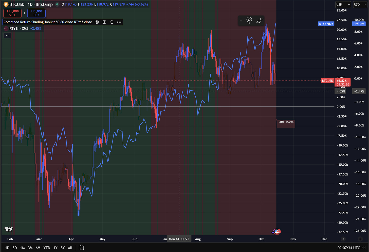 The other thing to note is that Bitcoin is also underperforming the Russell. The Russell has a lot more cyclical components in it, so it rallies when the economy is actually doing well and capital is moving out the risk curve. So think about it like this, macro liquidity in the system is expanding but its just not going to Bitcoin.