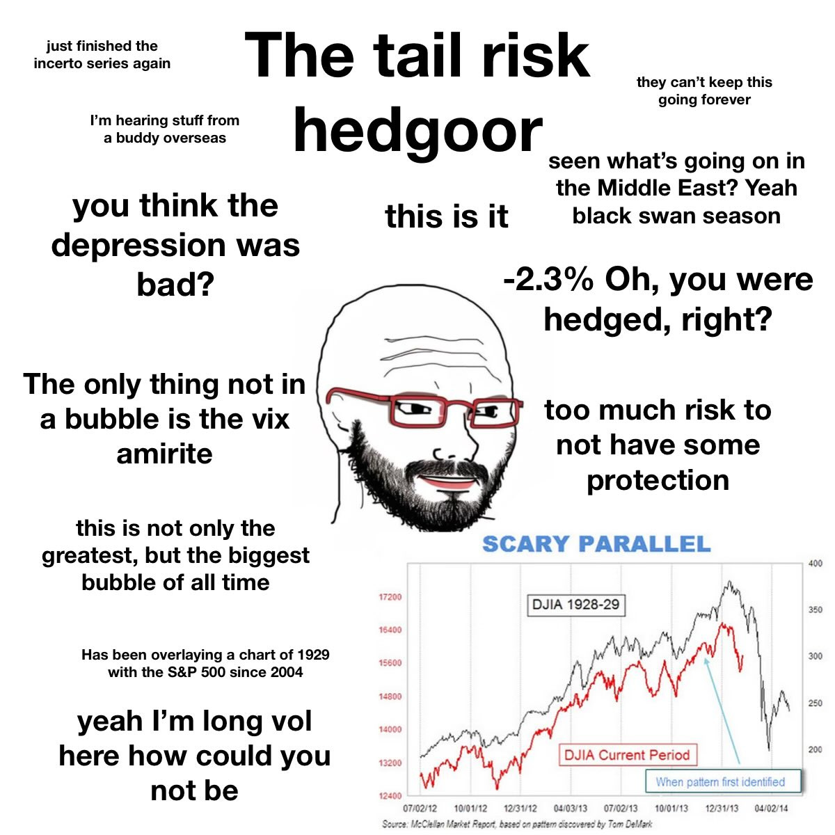 Since so many people talk about the extreme tails, they become the boy who cries wolf. By definition, the tails occur with less frequency but amplifying them brings you more attention. (meme source: Link)