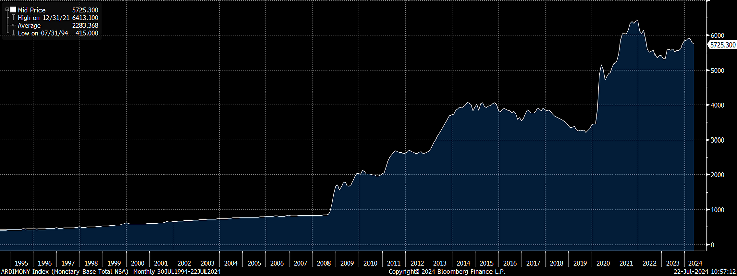 However, overall, assets continue to reflect the constraints that exist from free flowing capital markets. Part of the assets and capital flows in markets are from the sovereign authorities managing the monetary base. The chart below is the data for the total monetary base: