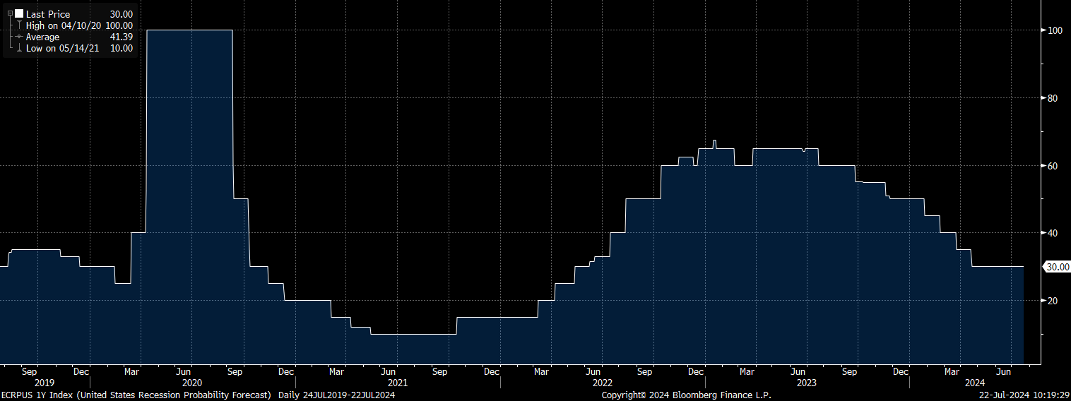 How does all of this connect with where we are on a macro basis? Well, there has been a consistent consensus among economists that a recession is a high probability. This was a consistent view through all of 2023 and when it didn’t happen, the bearish positioning had to be unwound thereby pushing equities UP. (chart: consensus probability of a recession in 1 year)